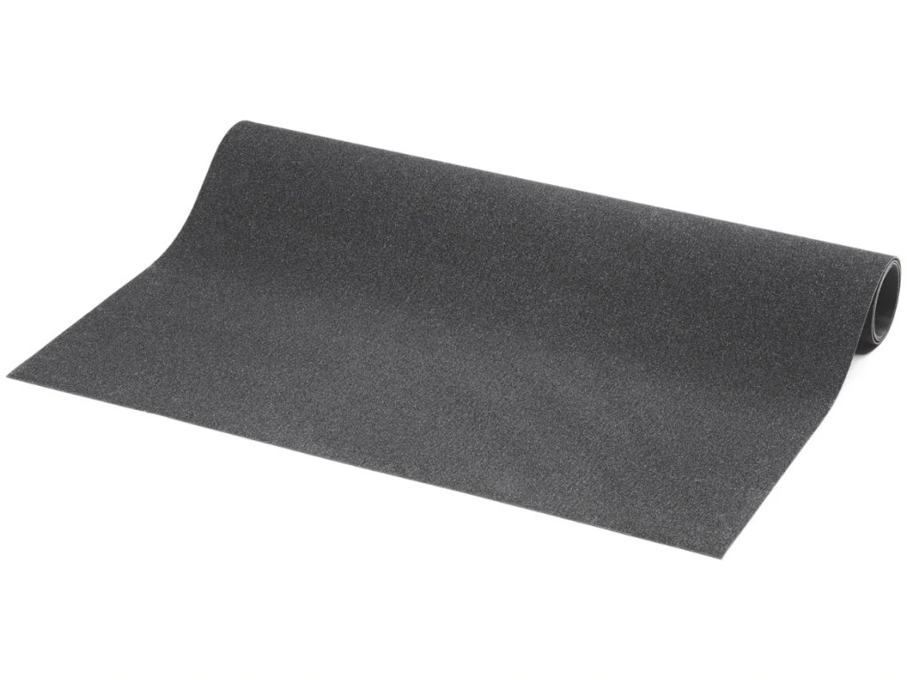 Klíčovým rozdílem je minerální brusivo na povrchu, které zajišťuje trakci i v extrémně mokrém nebo zaolejovaném prostředí – tam, kde klasické gumové rohože s drážkovaným povrchem nestačí. Tenký profil 2,1 mm navíc umožňuje použití i na místech, kde by silnější rohož překážela.
