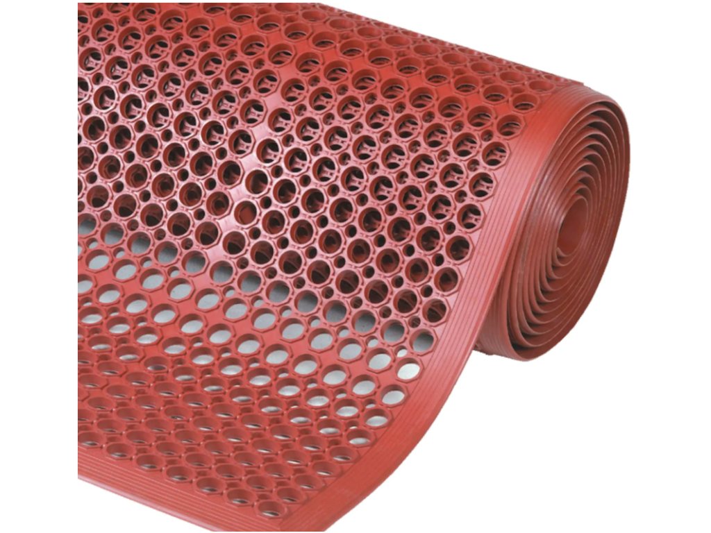 Protiskluzová drenážní rohož ze 75% nitrilové gumy (NBR) v červeném provedení. Má šikmou náběhovou hranu na všech 4 stranách pro minimalizaci rizika zakopnutí, otvory pro odtok tekutin a propadávání nečistot a výstupky pro vyšší adhezi. Odlehčená konstrukce usnadňuje manipulaci při úklidu.