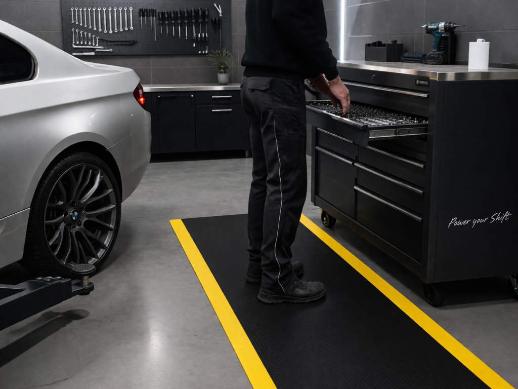 Protiúnavová rohož pro suchá pracoviště s přerušovaným stáním – pružná pěna 9,5 mm rovnoměrně tlumí tlak a snižuje únavu při stání do 3 hodin denně. Ideální vstupní volba do světa protiúnavových rohožích – solidní ergonomický komfort za dostupnou cenu. Povrch „sloní kůže", výroba v Evropě, certifikace REACH a 2 roky záruky výrobce.